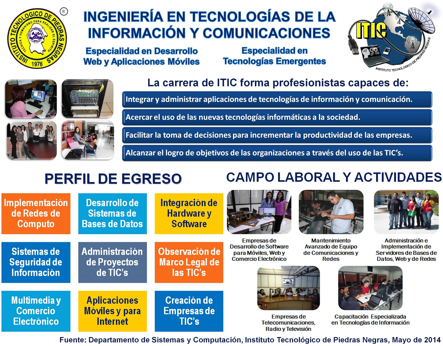 • Formar profesionistas capaces de integrar y administrar tecnologías de la información y comunicaciones, que contribuyan a la productividad y el logro de los objetivos estratégicos de las organizaciones; caracterizándose por ser líderes, críticos, competentes, éticos y con visión empresarial, comprometidos con el desarrollo sustentable.